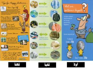 فليدفع المواطن تكلفة جمع وفصل العبوات عند شرائها (مثال: اذا كانت زجاجة المياه الغازية بجنيه، يدفع جنيه و عشرة قروش) فاذا قام برد العبوة الفارغة لأحد مراكز التجميع، يسترد العشرة قروش. ولننظر الي النشرة التي تشرح للمواطن الفكرة وانظر الي ترتيب و تدرج الأفكار